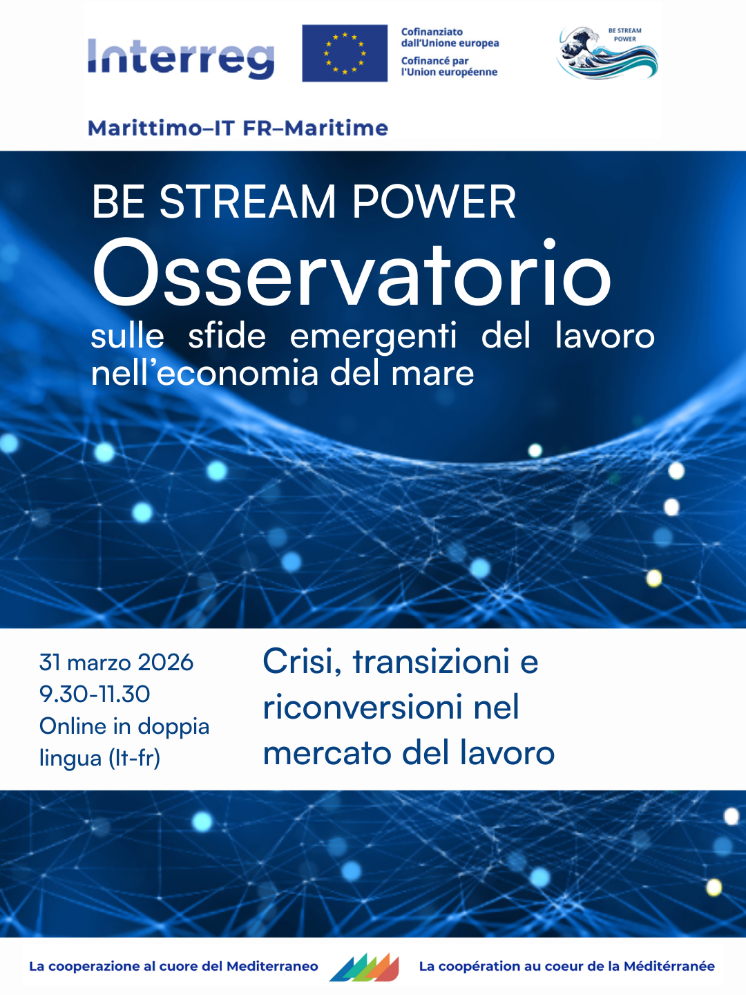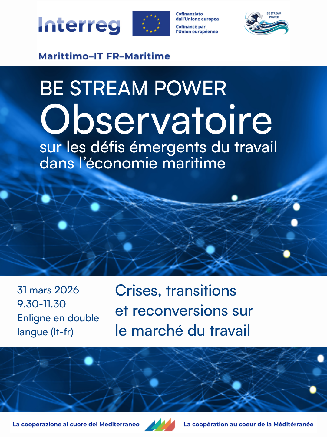 CRISES, TRANSITIONS ET RECONVERSIONS SUR LE MARCHE' DU TRAVAIL - QUATRIÈME RENCONTRE EN LIGNE BILINGUE ITA-FRA DE L'OBSERVATOIRE SUR LES DÉFIS ÉMERGENTS DU TRAVAIL DANS L'ÉCONOMIE BLEUE: 31 MARS 2026 DE 9H30 À 11H30